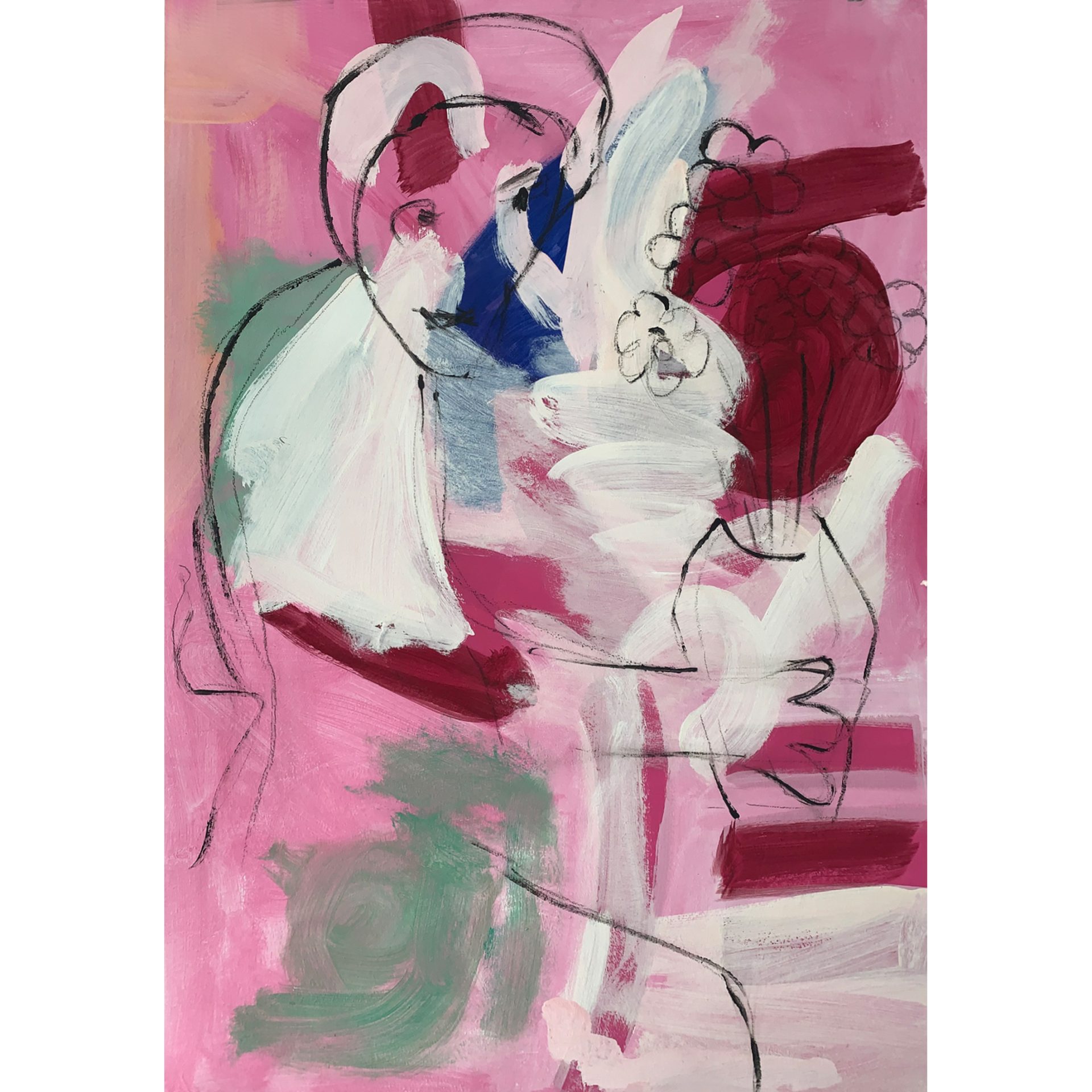 Zarte Linien umspielen Farbflächen in Rosa, Weiß und Blau – eine Begegnung zwischen Figur und Form.