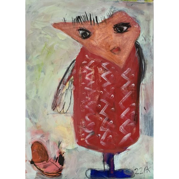 The artwork “Girl in a dress ” (acrylic dispersion with pigment, 120 x 85 cm) shows the silhouette of a girl in a red-patterned dress.The surface of the picture is lively and varied thanks to the acrylic dispersion used, which gives the motif depth and texture.The coloring is subtle, in soft tones, which gives the picture a calm, almost dreamy atmosphere.The girl seems to be caught in a slight movement and looks the viewer directly in the eye, which lends the work a dynamic grace, but also has a somewhat challenging effect.