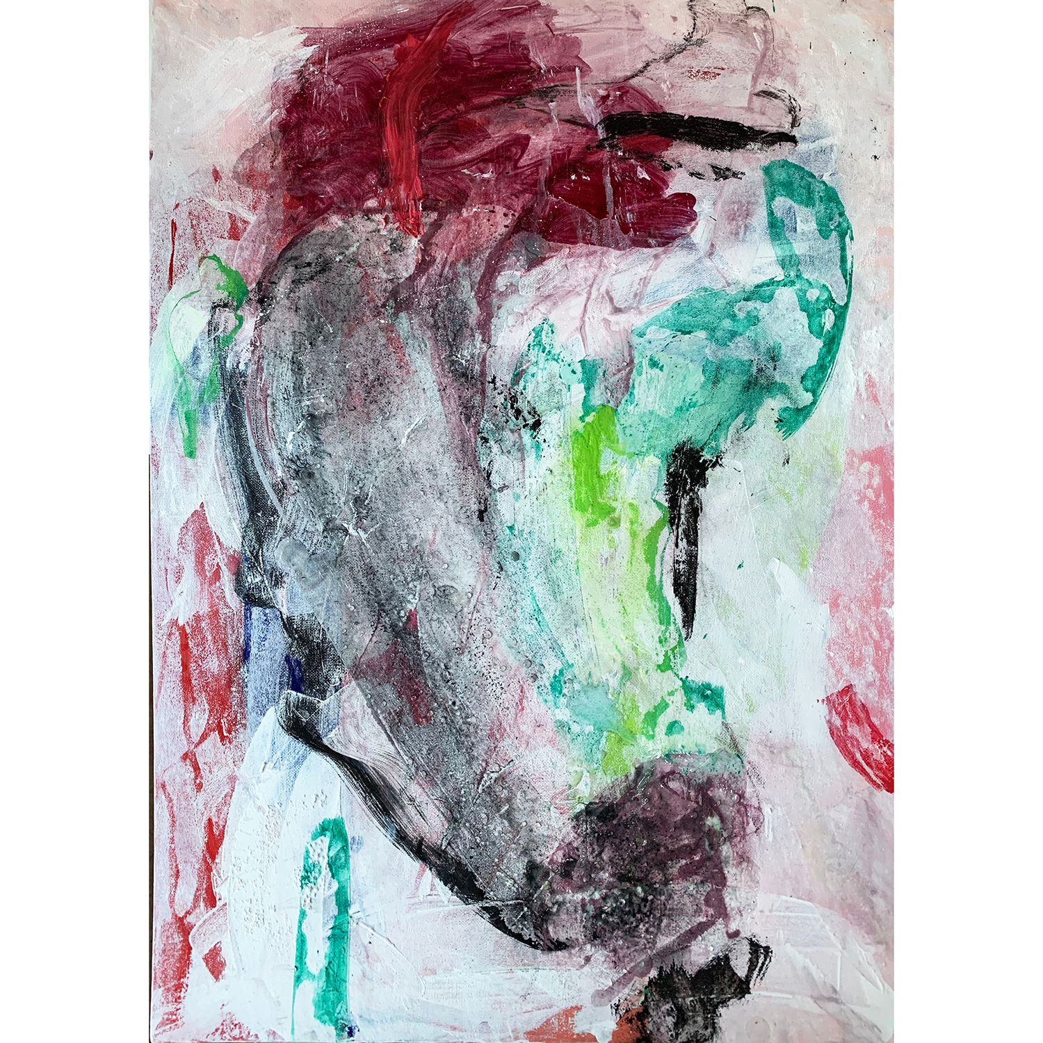 Figuren tauchen auf – oft maskiert, manchmal nur als Geste – und bewegen sich zwischen Intimität und Abstraktion. Mich beschäftigt, wie sich Identität aus Layern bildet: aus Rollen, Schutz, Erinnerung. Darum arbeite ich sichtbar: Kanten, Übermalungen und das Herauslösen von Farbe gehören zum Bildgedächtnis.