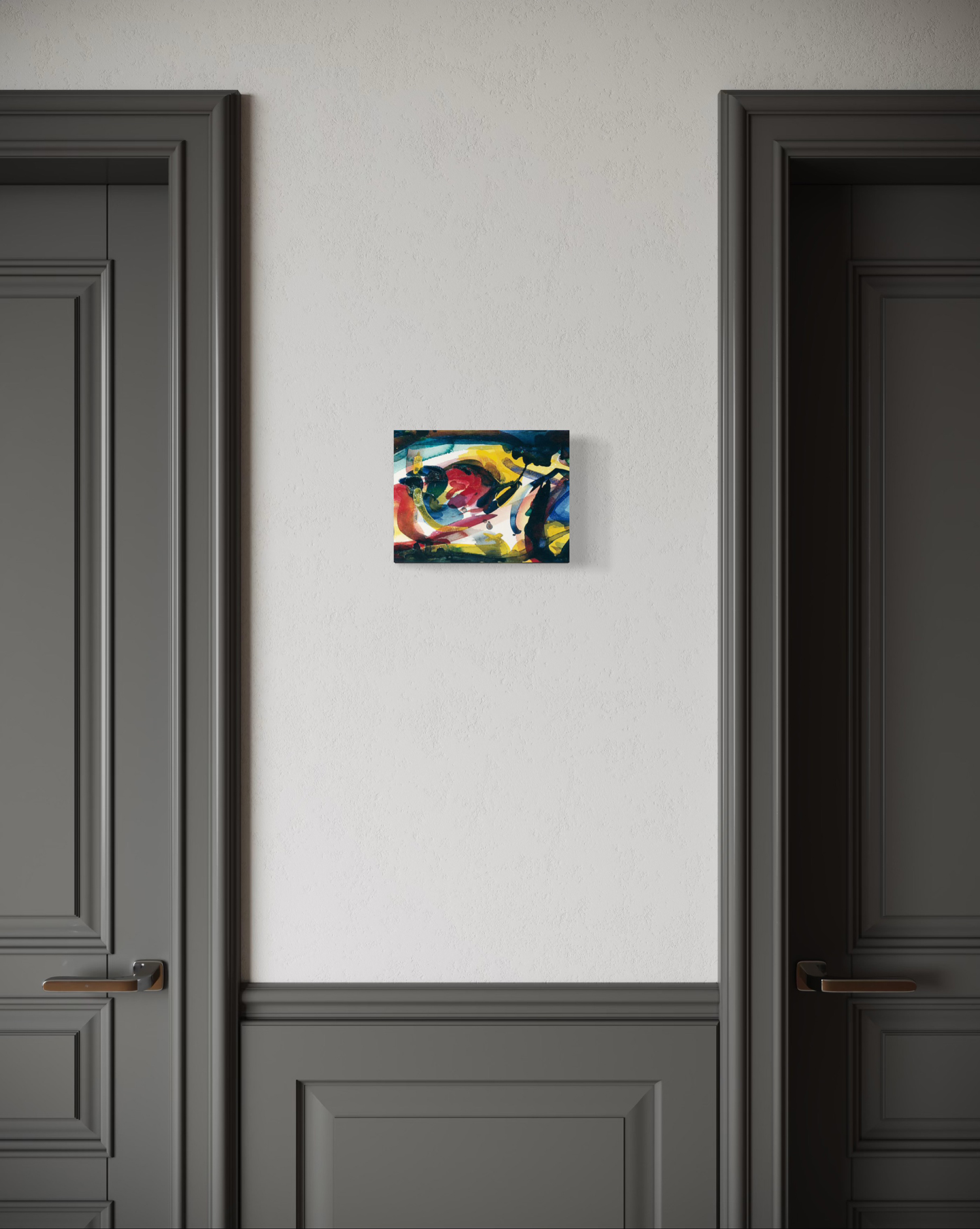 Figuren tauchen auf – oft maskiert, manchmal nur als Geste – und bewegen sich zwischen Intimität und Abstraktion. Mich beschäftigt, wie sich Identität aus Layern bildet: aus Rollen, Schutz, Erinnerung. Darum arbeite ich sichtbar: Kanten, Übermalungen und das Herauslösen von Farbe gehören zum Bildgedächtnis.