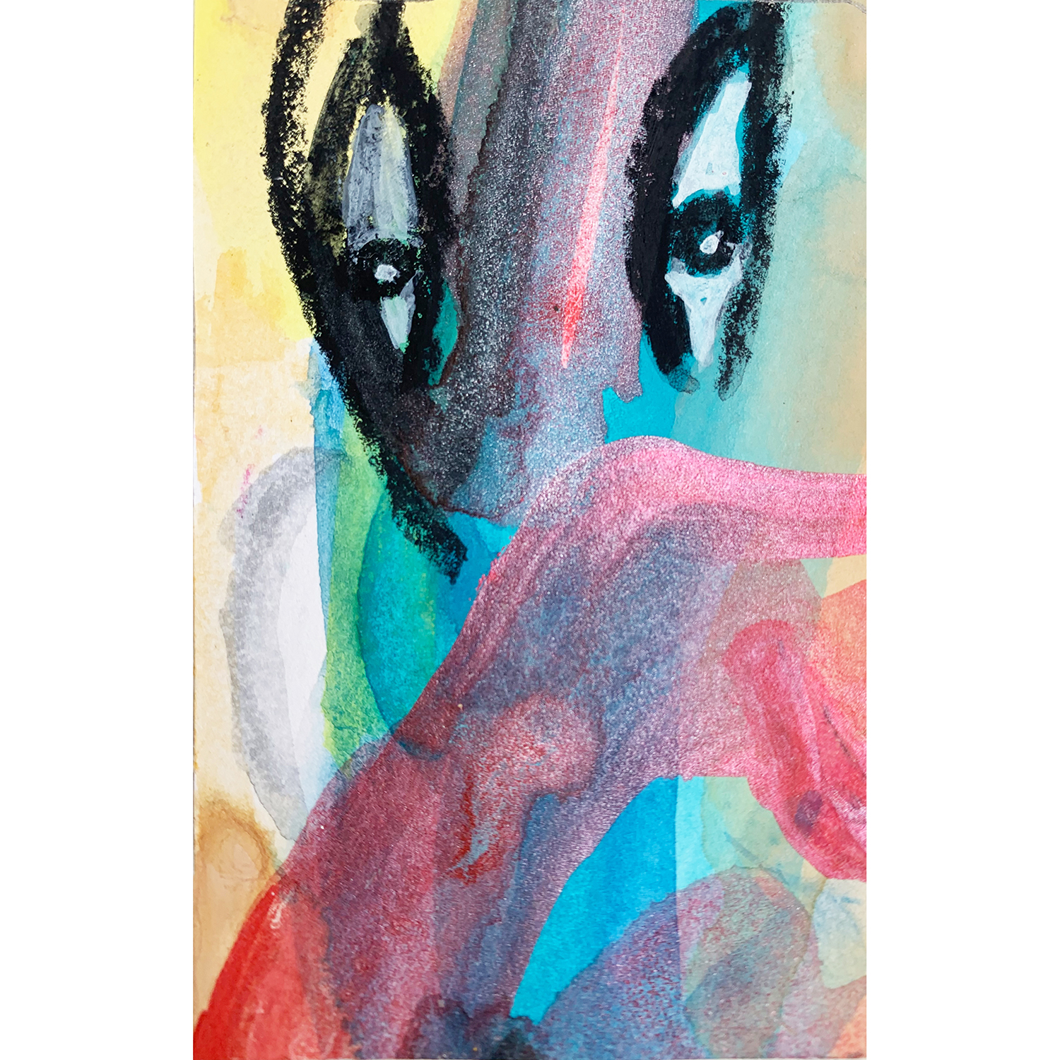 Figuren tauchen auf – oft maskiert, manchmal nur als Geste – und bewegen sich zwischen Intimität und Abstraktion. Mich beschäftigt, wie sich Identität aus Layern bildet: aus Rollen, Schutz, Erinnerung. Darum arbeite ich sichtbar: Kanten, Übermalungen und das Herauslösen von Farbe gehören zum Bildgedächtnis.