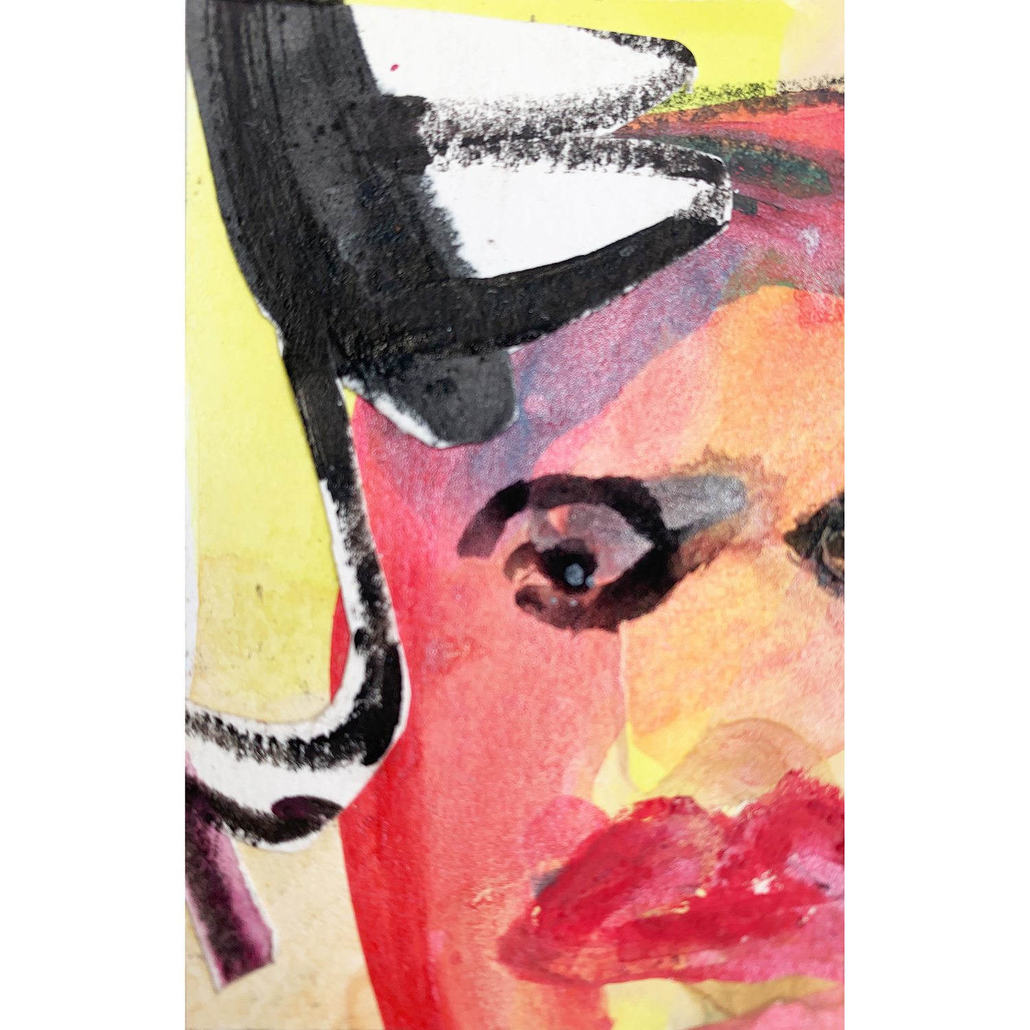 Figuren tauchen auf – oft maskiert, manchmal nur als Geste – und bewegen sich zwischen Intimität und Abstraktion. Mich beschäftigt, wie sich Identität aus Layern bildet: aus Rollen, Schutz, Erinnerung. Darum arbeite ich sichtbar: Kanten, Übermalungen und das Herauslösen von Farbe gehören zum Bildgedächtnis.